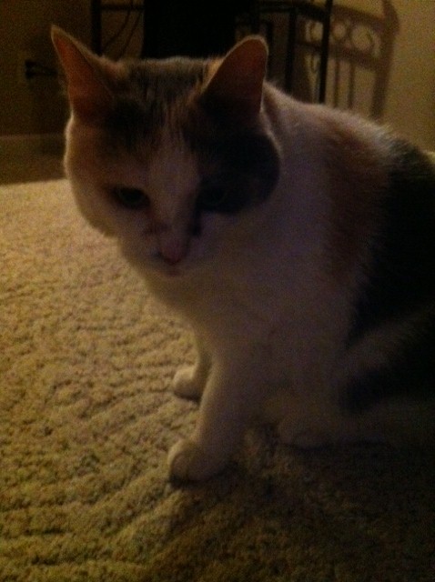 This morning, Coco had an appointment at the vet to see why she's peeing in the house now, after years of being a part of this family, and to also see why her eyes are weird, which they are. I got out my kitty transport box, picked up my obese cat, and tried to shut her in. It did not work.